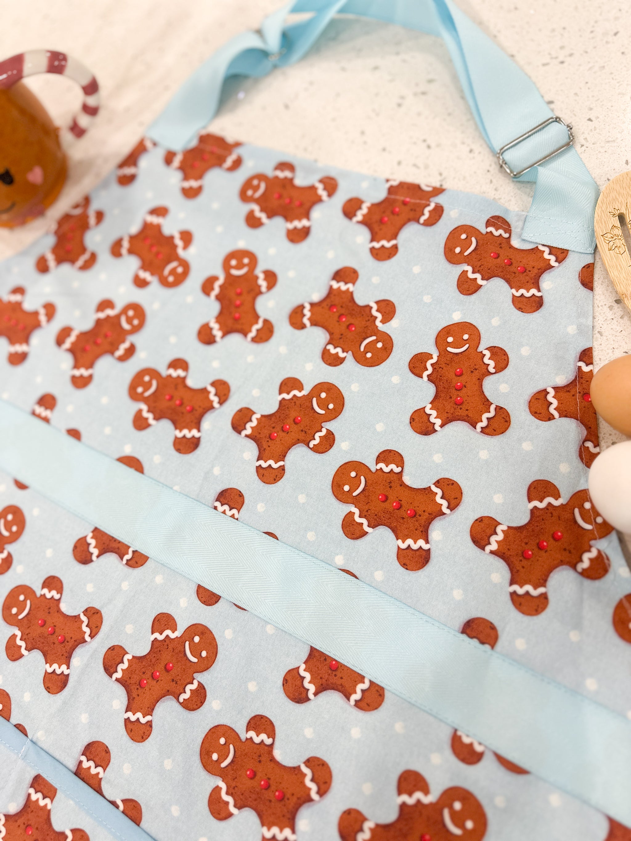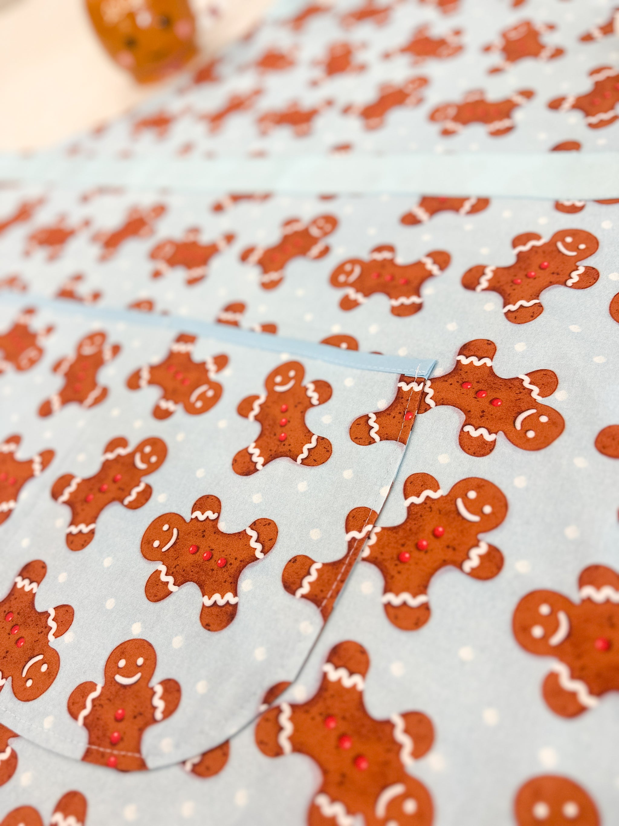 Meet the Frosted Gingerbread Apron—cookie-cute on a winter-sky blue, built for comfort and full coverage.