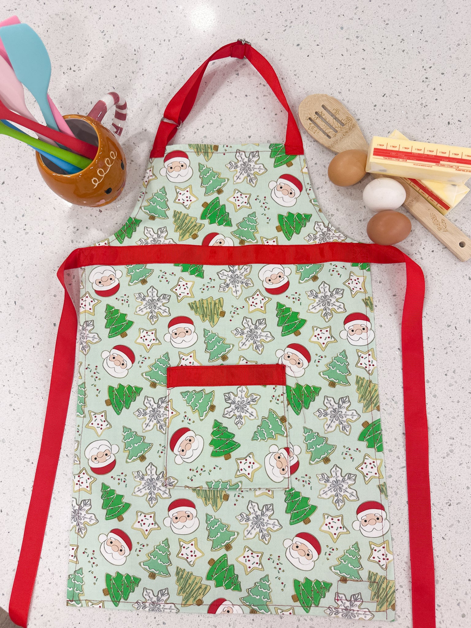 Grow-with-me mint Santa apron—adjustable neck, extra-long ties, and a treasure-ready pocket.